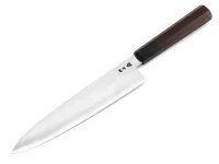 . Der Klingen-Kern besteht aus VG-10 Stahl, der mit insgesamt 34 Lagen Damast Stahl ummantelt ist. Dabei setzt Yoshimi Kato zwei unterschiedliche Sorten von Damast Stahl ein, um das optimale Härte-Flexibilität Verhältnis zu erreichen. Das ungewöhnliche Hammering der Klinge im oberen Teil ist nicht nur ein auffallendes Design-Merkmal, es hat bei Tests auch sehr gute Anti-Haft Effekte gezeigt. Die Form