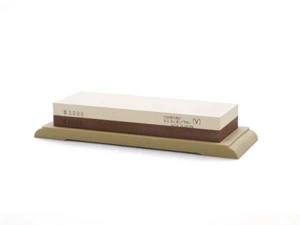 Japanischer Wasser-Schleifstein mit zwei Körnungen nach JIS-Japan. Inklusive einem Schleifsteinhalter aus Kunststoff. Körnung 1000: für das Schärfen der Messer. Körnung 3000: für das Schärfen, Feinschliff und Abziehen der Messer. Es handelt sich um einen synthetischen Stein, der aus Aluminiumoxid, Feldspat und Siliciumdioxid besteht – wie bei japanischen Schleifsteinen üblich. Der Stein ist eine Empfehlung einer unserer Messer-Schmieden und ist für alle japanischen Messer-Stähle verwendbar. Je Zustand der zu schleifenden Messer ist eine Ergänzung mit eine Schleifstein mit gröberer Körnung – 800 oder gröber – als Arato (Schruppstein) sinnvoll. Bitte beachten Sie bei Verwendung die beigelegten Tipps.