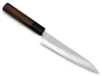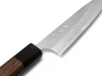 mit einer Klingenlänge von ca. 150 mm ist ein echtes Universalgenie unter den Küchenmessern. Kaum ein anderes Messer wird so oft genutzt, wie dieses Allzweck Kochmesser. Das handgeschmiedete Kochmesser ist aus Aogami Super von Yoshimi Kato gefertigt und mit dem dekorativen und auch funktionellen Finisch Nashiji (Pear Skin) versehen. Die geschnittenen Scheiben haften kaum am Messer und erleichtern die Arbeit sehr. Aogami Super ist der Kohlenstoffstahl mit dem höchsten Schärfepotential.